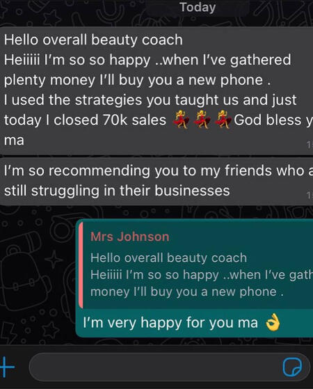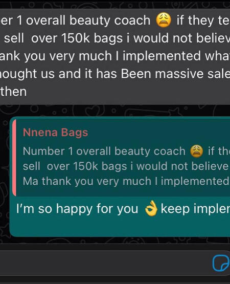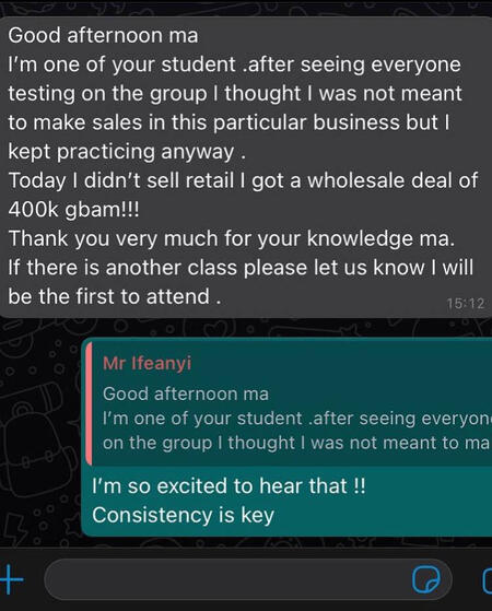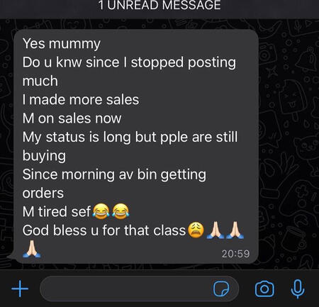 I was selling so much people began to ask me my secret and I was able to give them tips I learnt from the WhatsApp marketing success .once you gain knowledge it sticks with you for life . ...One of the tips and lesson i learnt from the program that i gave people is that the more eyeball see your product , the more you sell